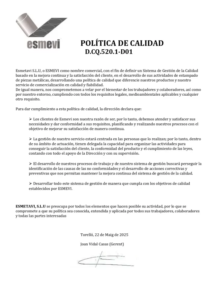 Política de calidad - Estampaciones Metálicas Vidal, SL